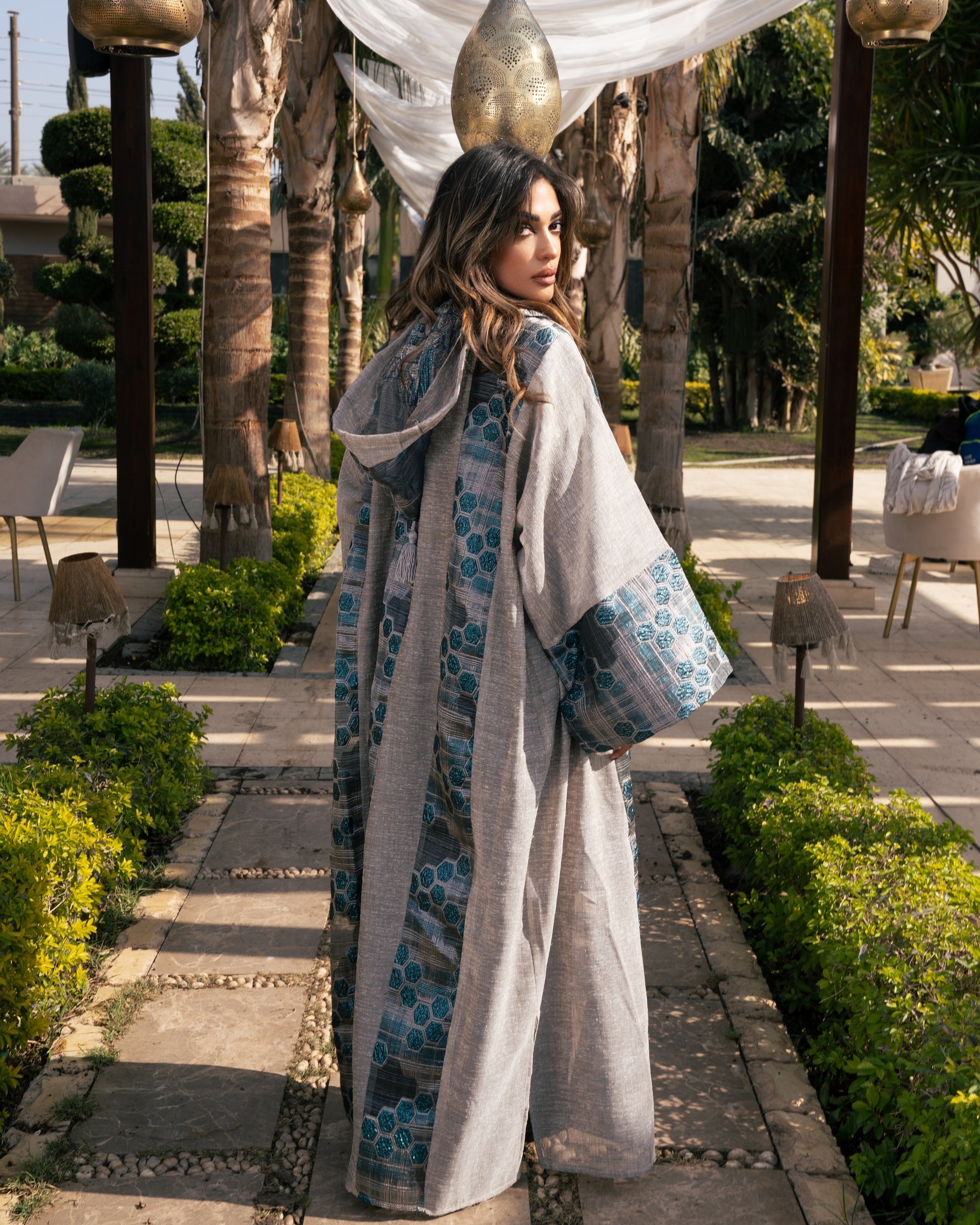 Detailed with an intricate metallic silver leaf pattern and structured linen-blend panels, offering a sophisticated contrast between delicate texture and bold design. Complete with a matching hood and a relaxed, open-front fit, it serves as a luxurious layering piece for both resort wear and formal evening occasions.