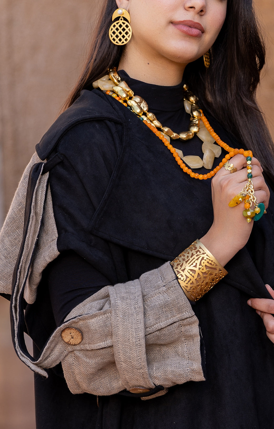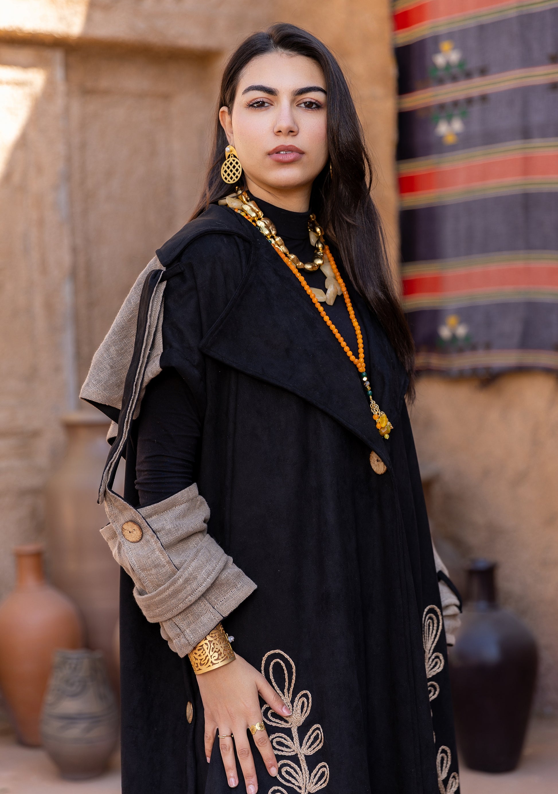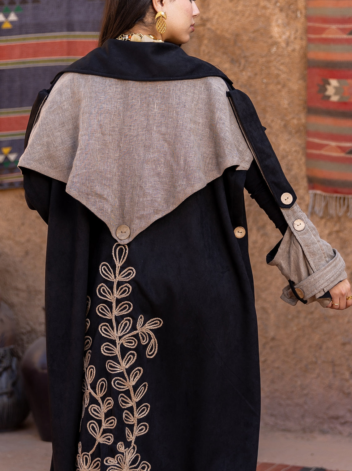 Gracefully tailored in black with delicate beige embroidery, this kaftan blends timeless elegance with artisanal charm. The flowing silhouette and contrast inner sleeves offer effortless sophistication for both formal and casual settings. A refined piece that celebrates heritage through modern design.