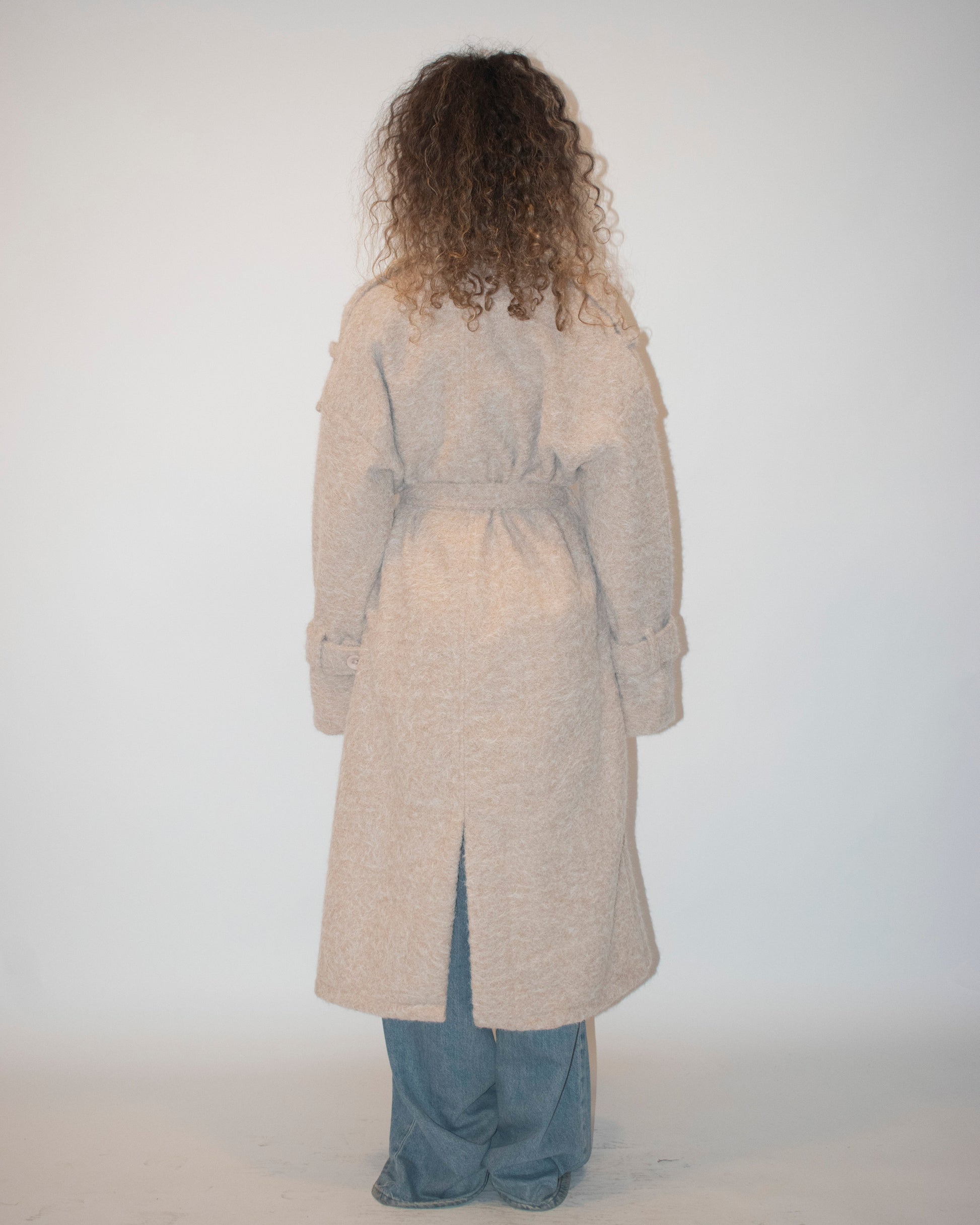 Crafted from a textured woven fabric with a rich, structured feel, the coat delivers a refined presence. Its high collar, belted waist, and elongated silhouette create a clean, sculpted shape. Subtle button details and a front slit add movement and tailored sophistication.