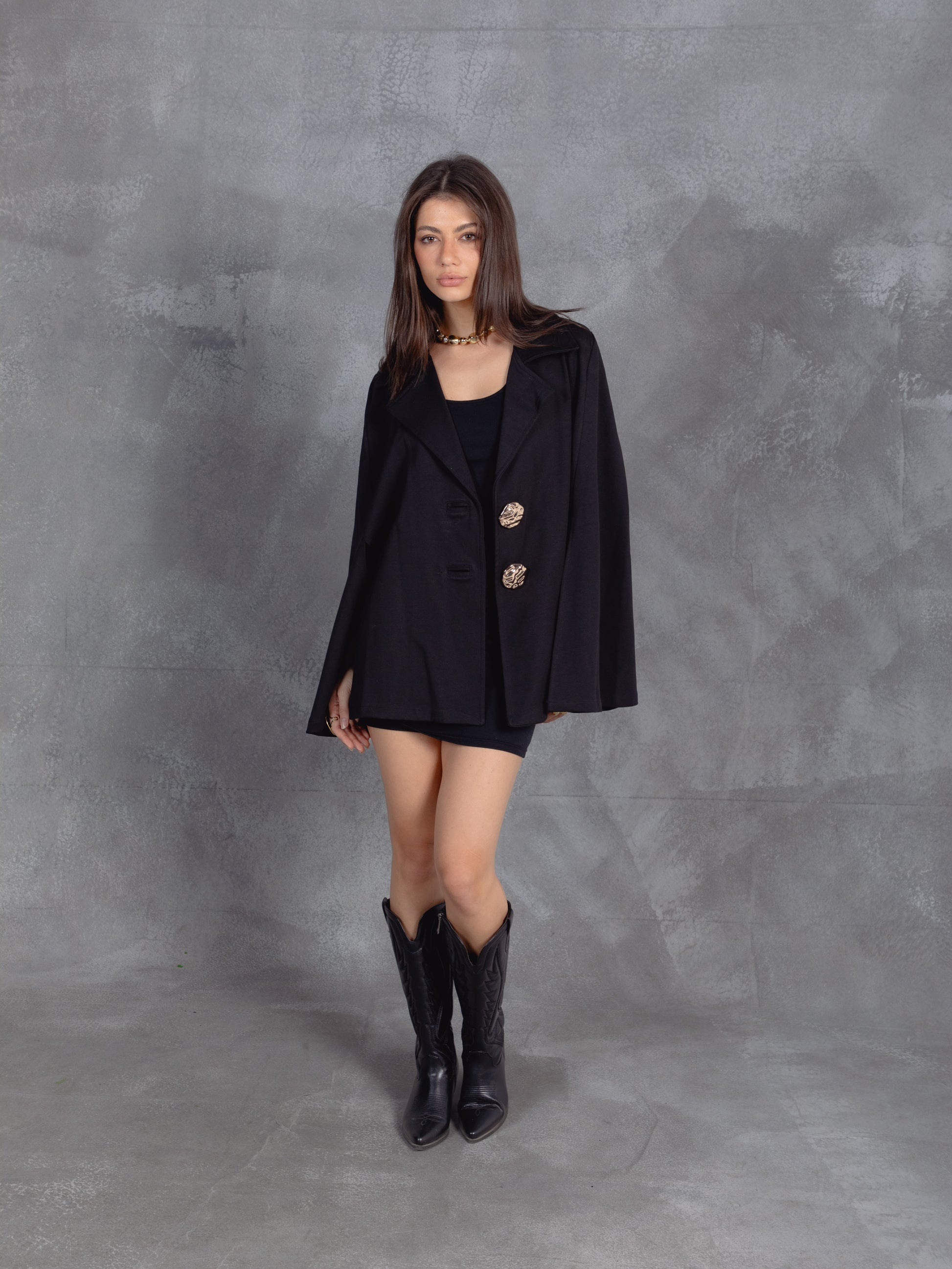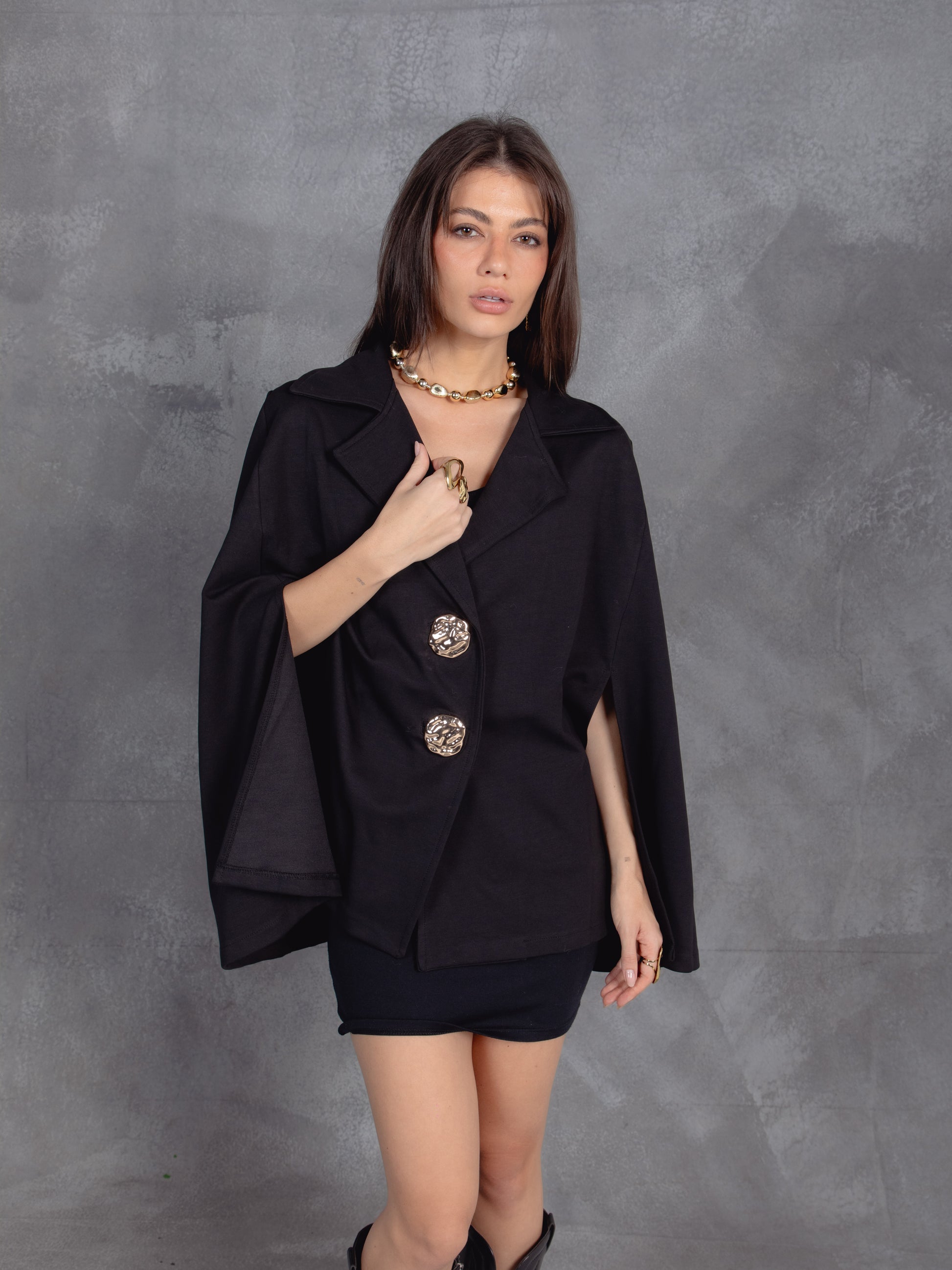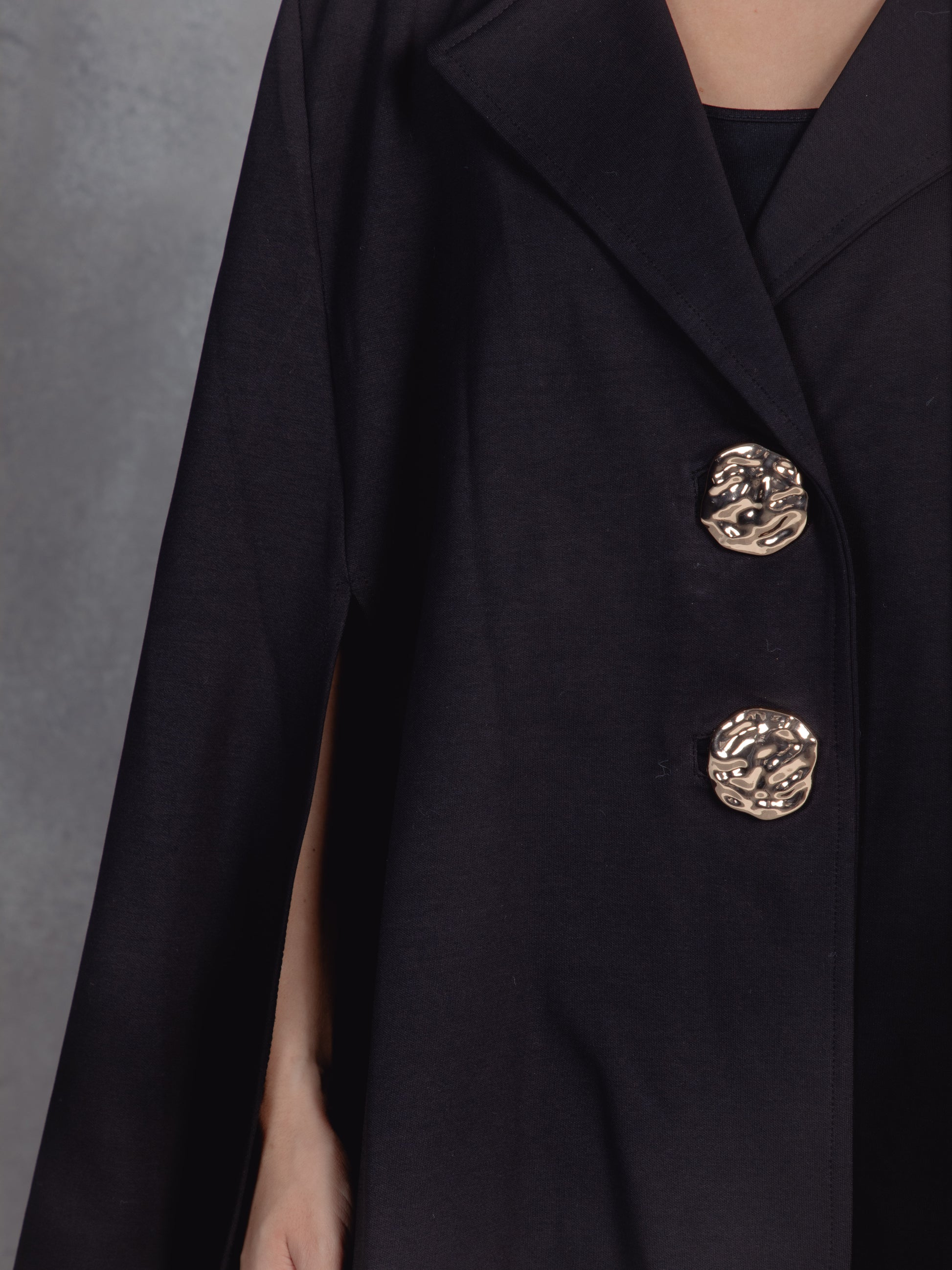 A structured cape with open sides and sculptural volume creates a fluid, architectural silhouette. Oversized metallic buttons add a regal, ornamental touch, blending classic elegance with modern flair.