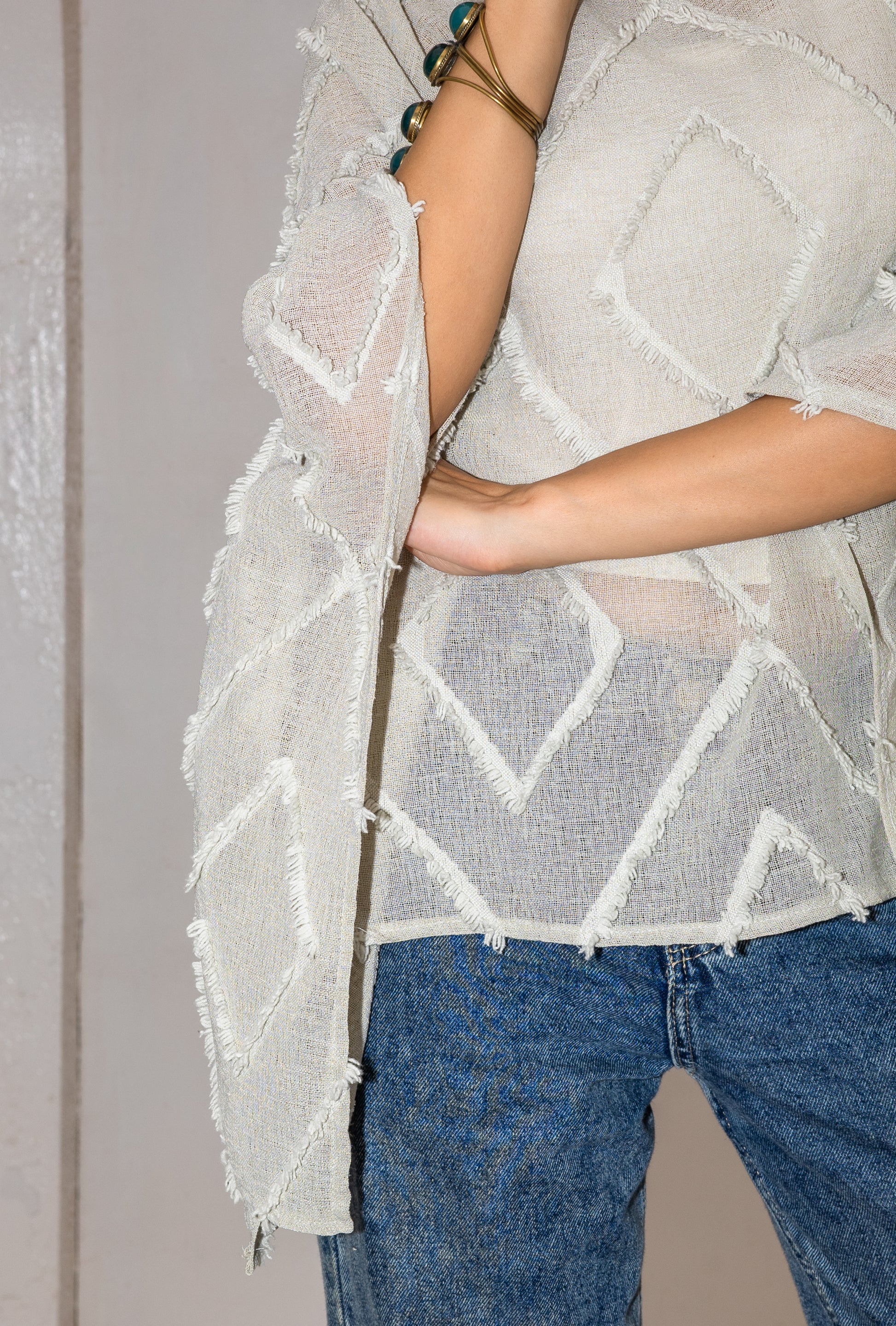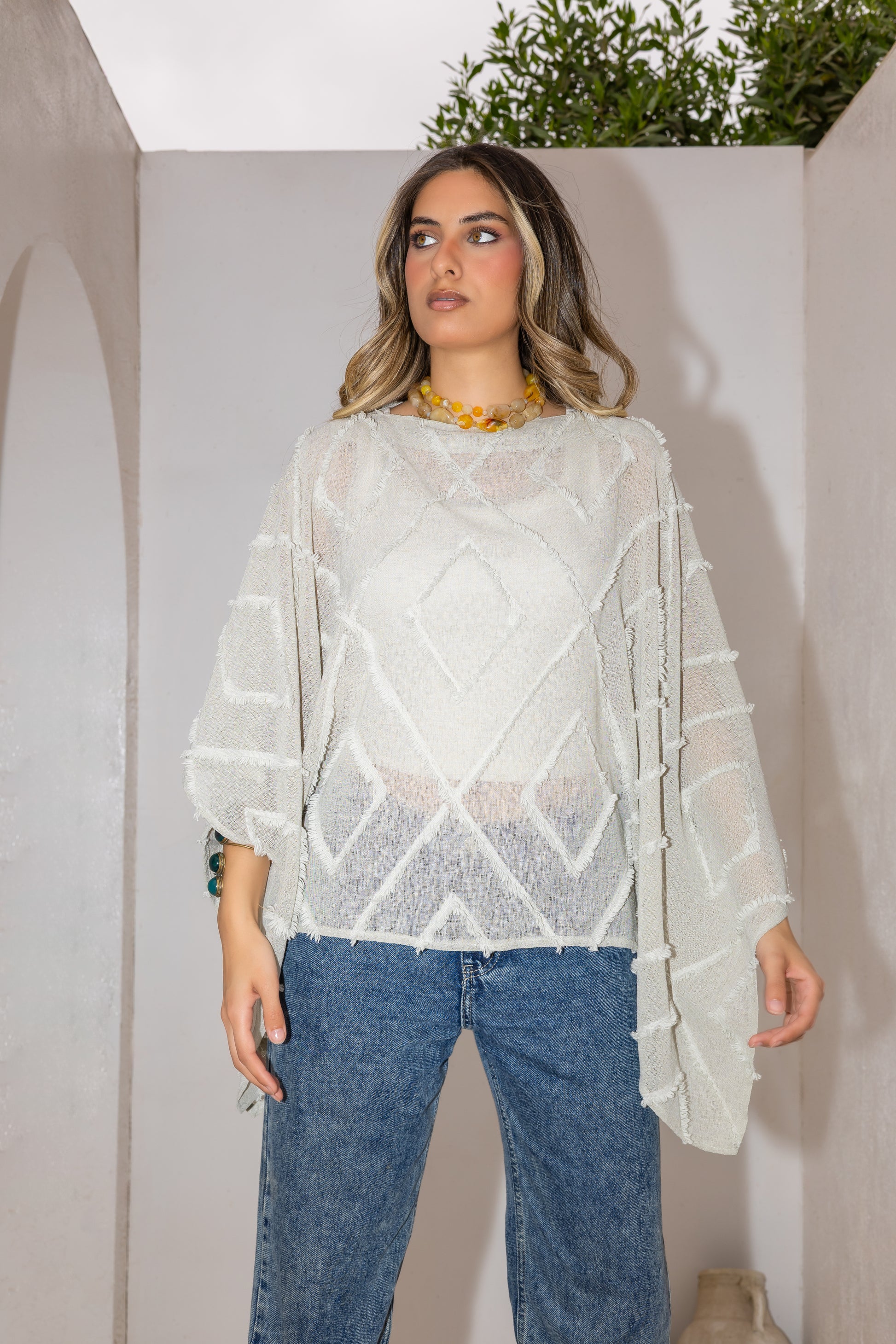 Loose-fitting garment with a textured diamond pattern, features wide, flowing sleeves and relaxed draped silhouette