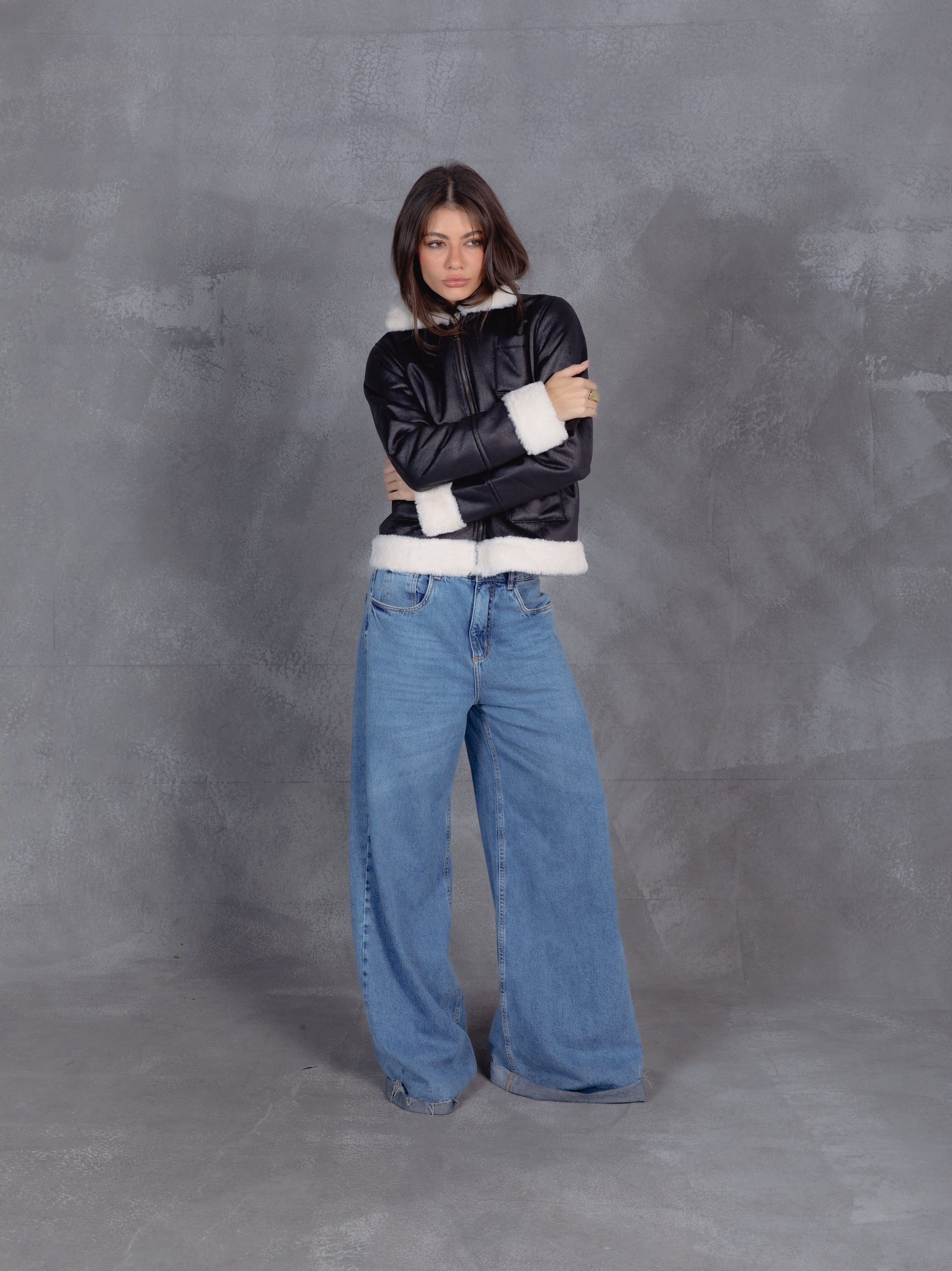 Edged in plush white fur, blending biker grit with winter luxe. The structured silhouette and gold accents elevate its cold-weather charisma. A statement piece that commands attention—warmth with attitude