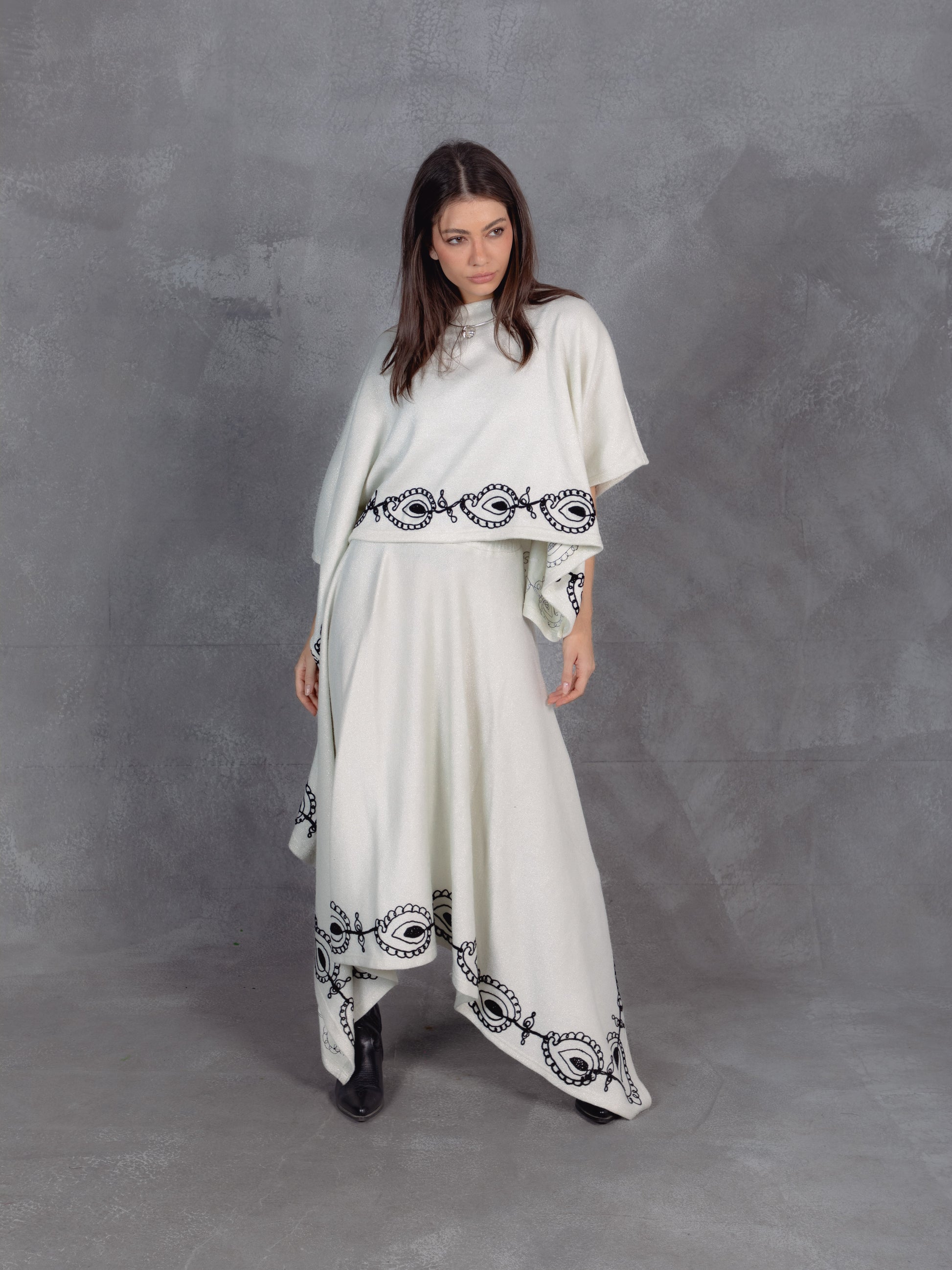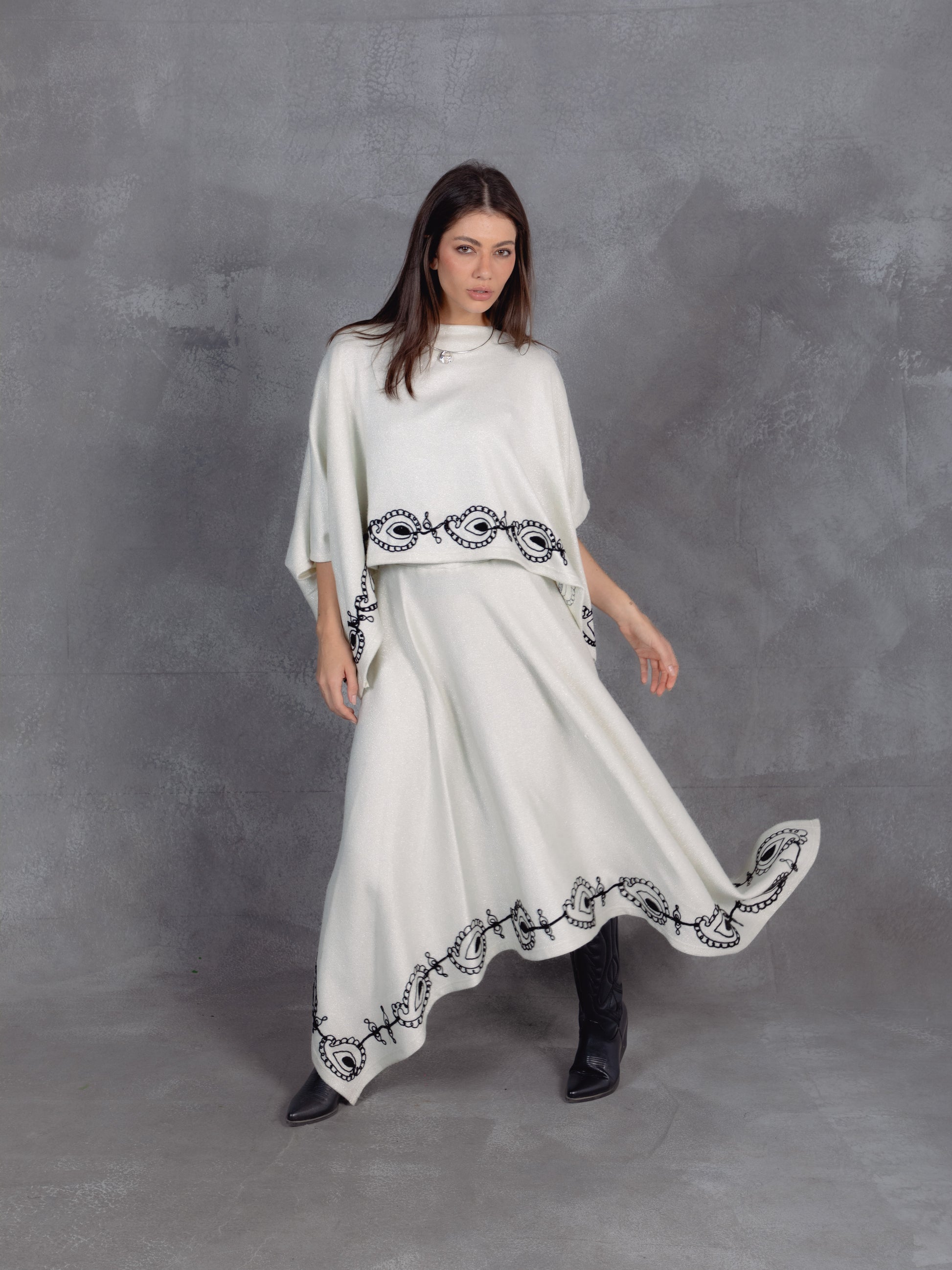 Black hem detailing adds graphic contrast to the soft drape of the top and skirt.