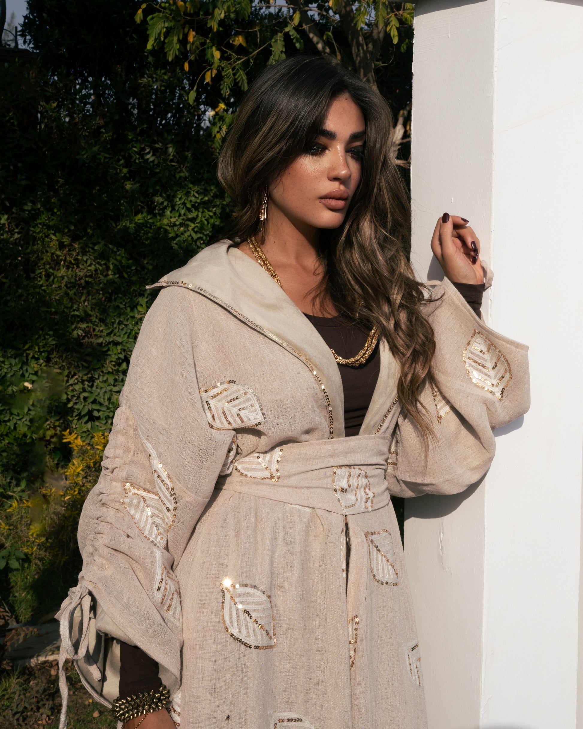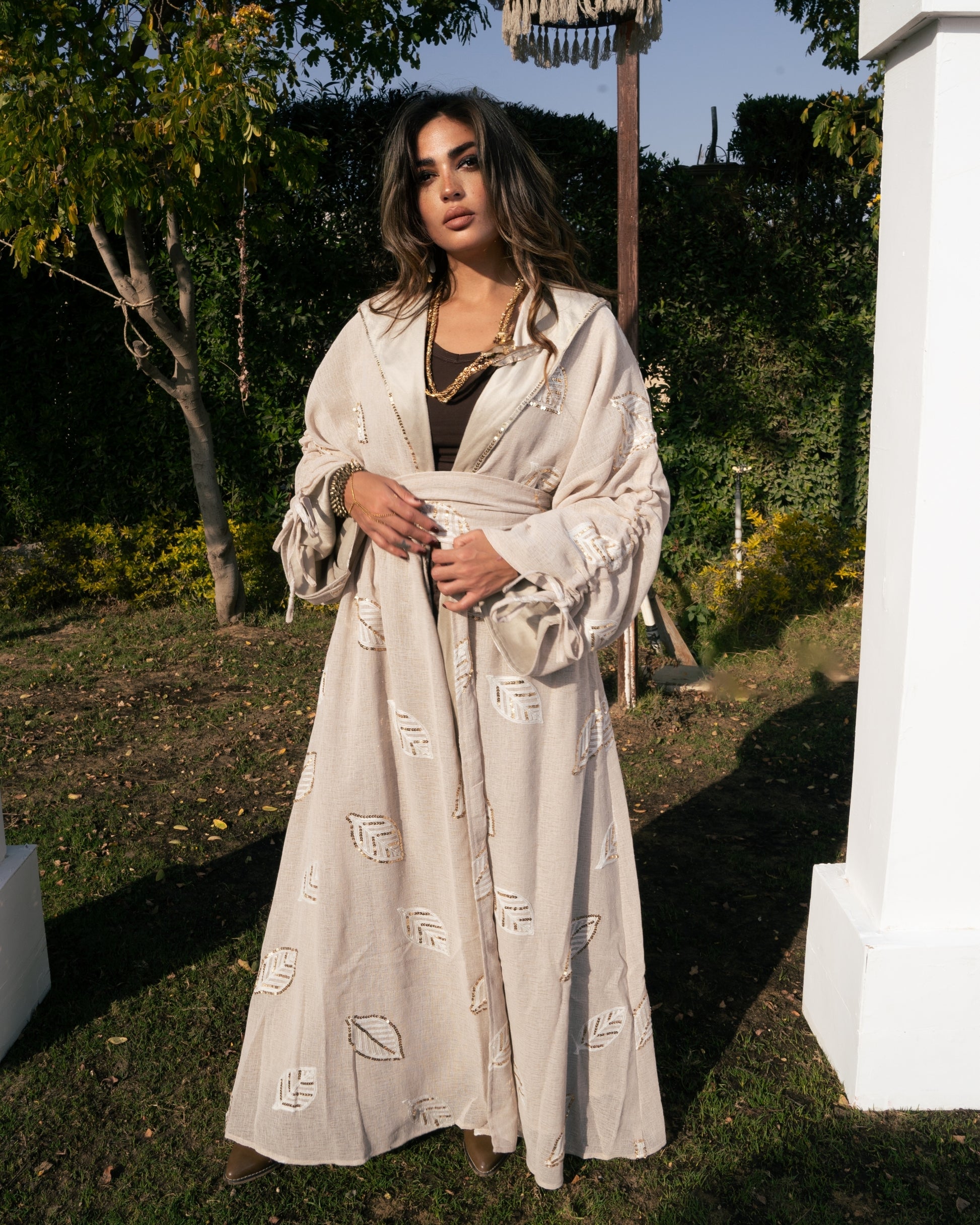 Luxurious linen kaftan, exquisitely lined with soft velvet for ultimate warmth and comfort. Featuring delicate embroidered leaf motifs, wide gathered sleeves, and a flattering wrap-style belt, this piece blends modern sophistication with timeless charm—perfect for day-to-evening wear.