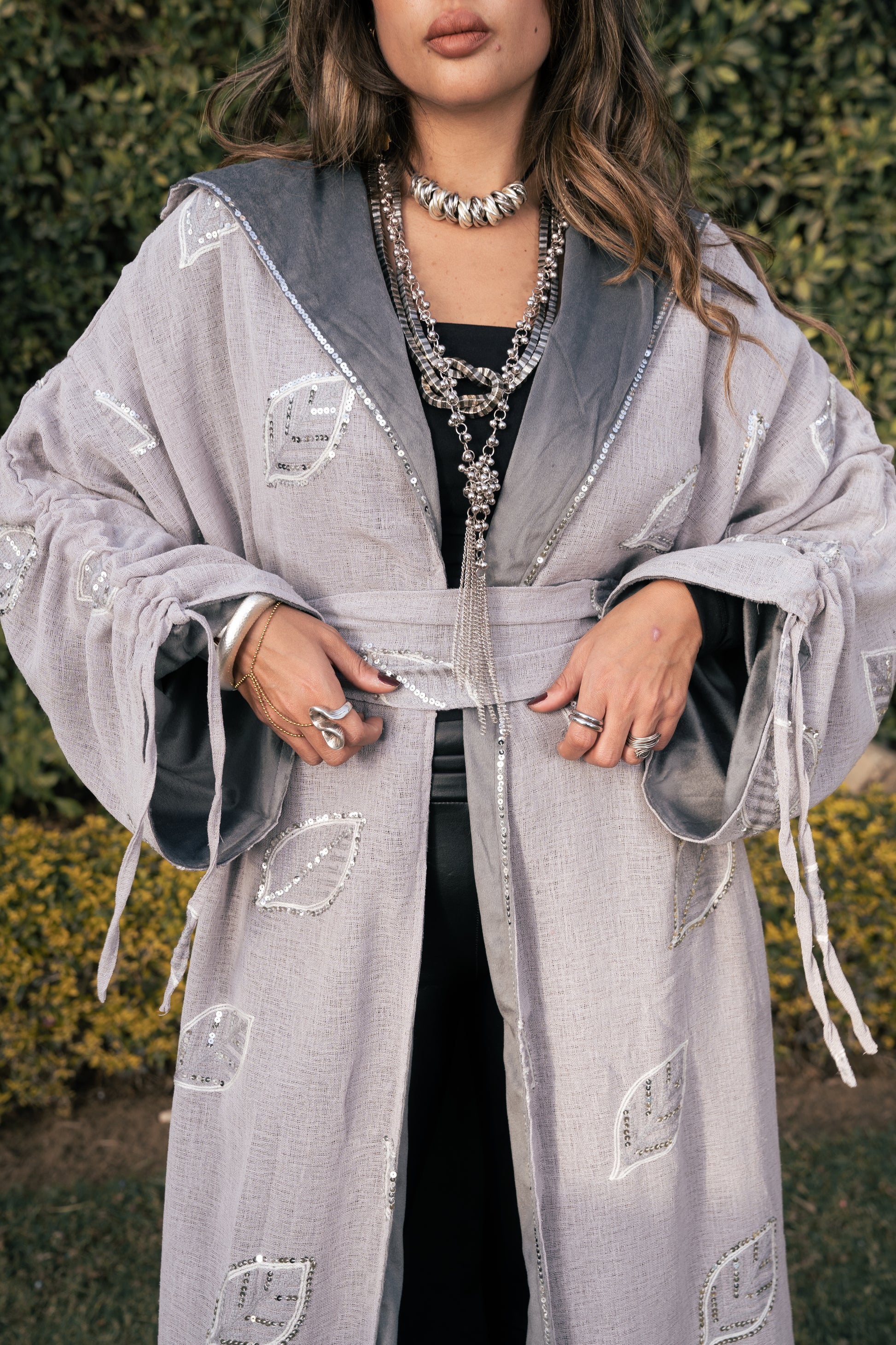 Luxurious linen kaftan, exquisitely lined with soft velvet for ultimate warmth and comfort. Featuring delicate embroidered leaf motifs, wide gathered sleeves, and a flattering wrap-style belt, this piece blends modern sophistication with timeless charm—perfect for day-to-evening wear.
