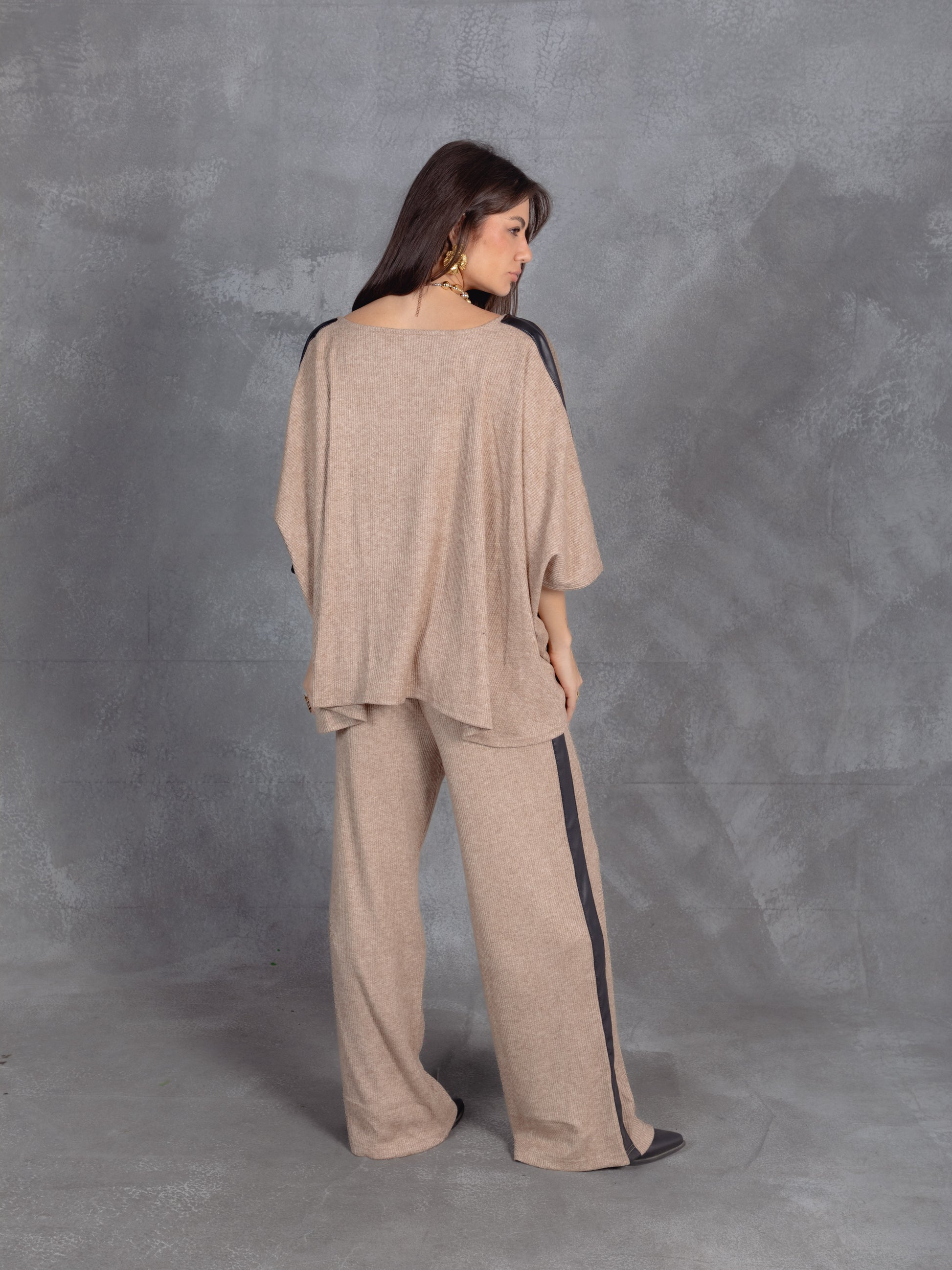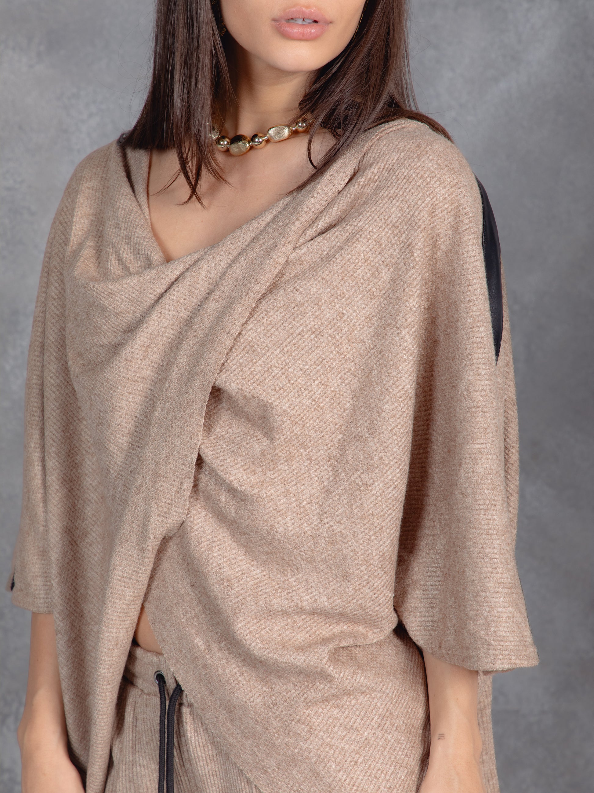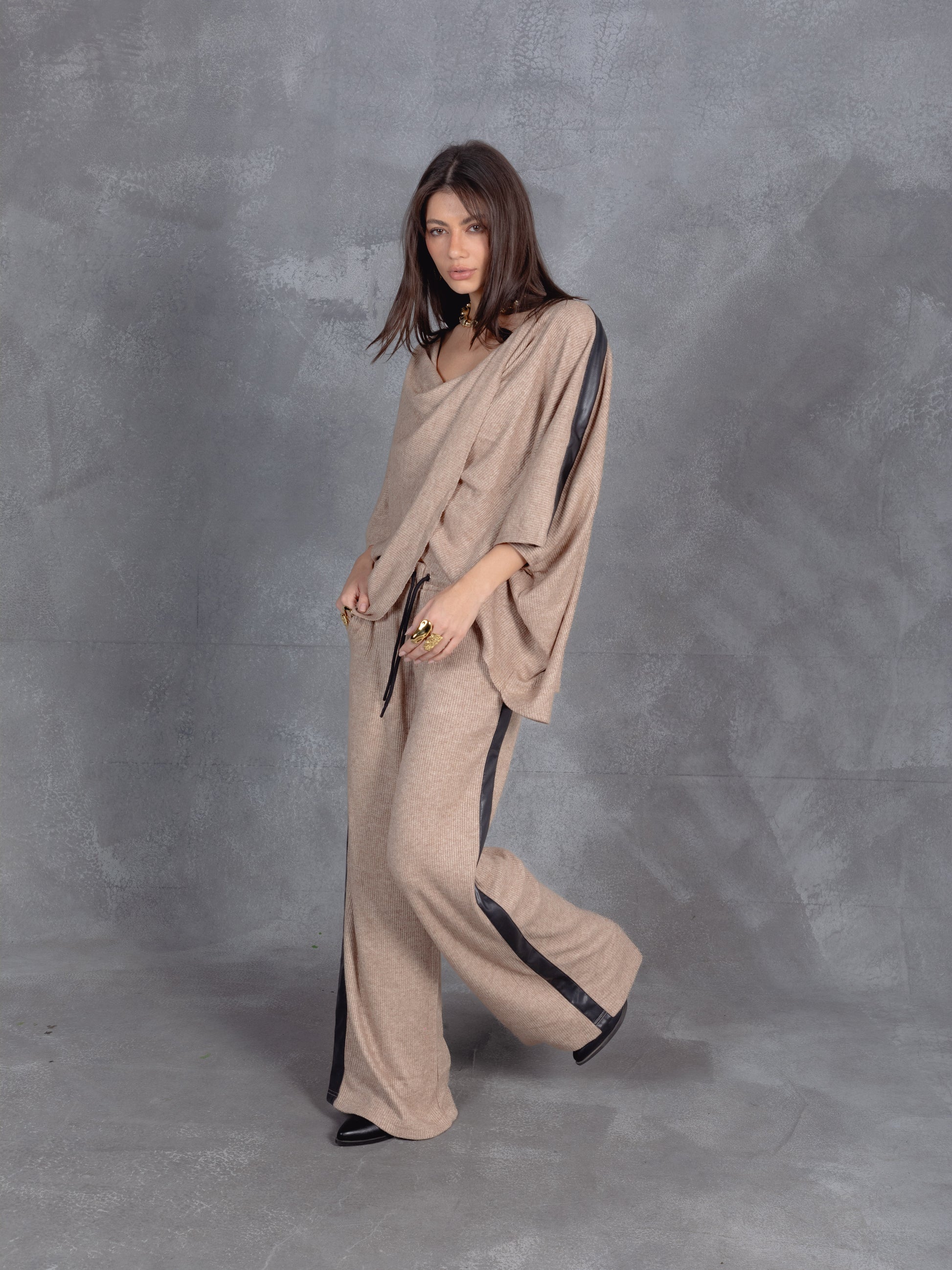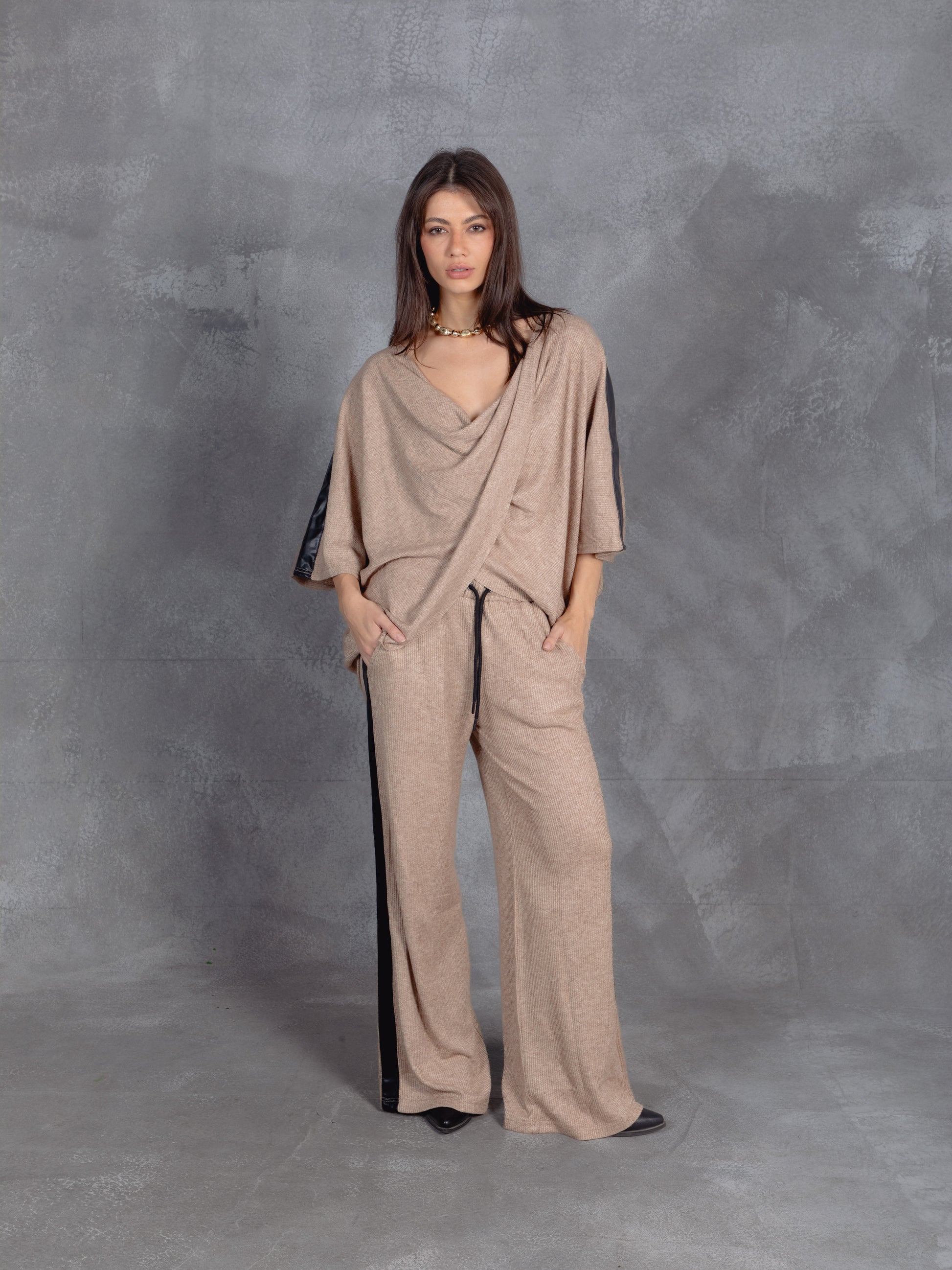 Soft structure meets urban ease in this draped co-ord. The wrap-style top and wide-leg drawstring pants offer effortless movement and modern minimalism. Layered with black accents, it’s a quiet statement in comfort-forward style.
