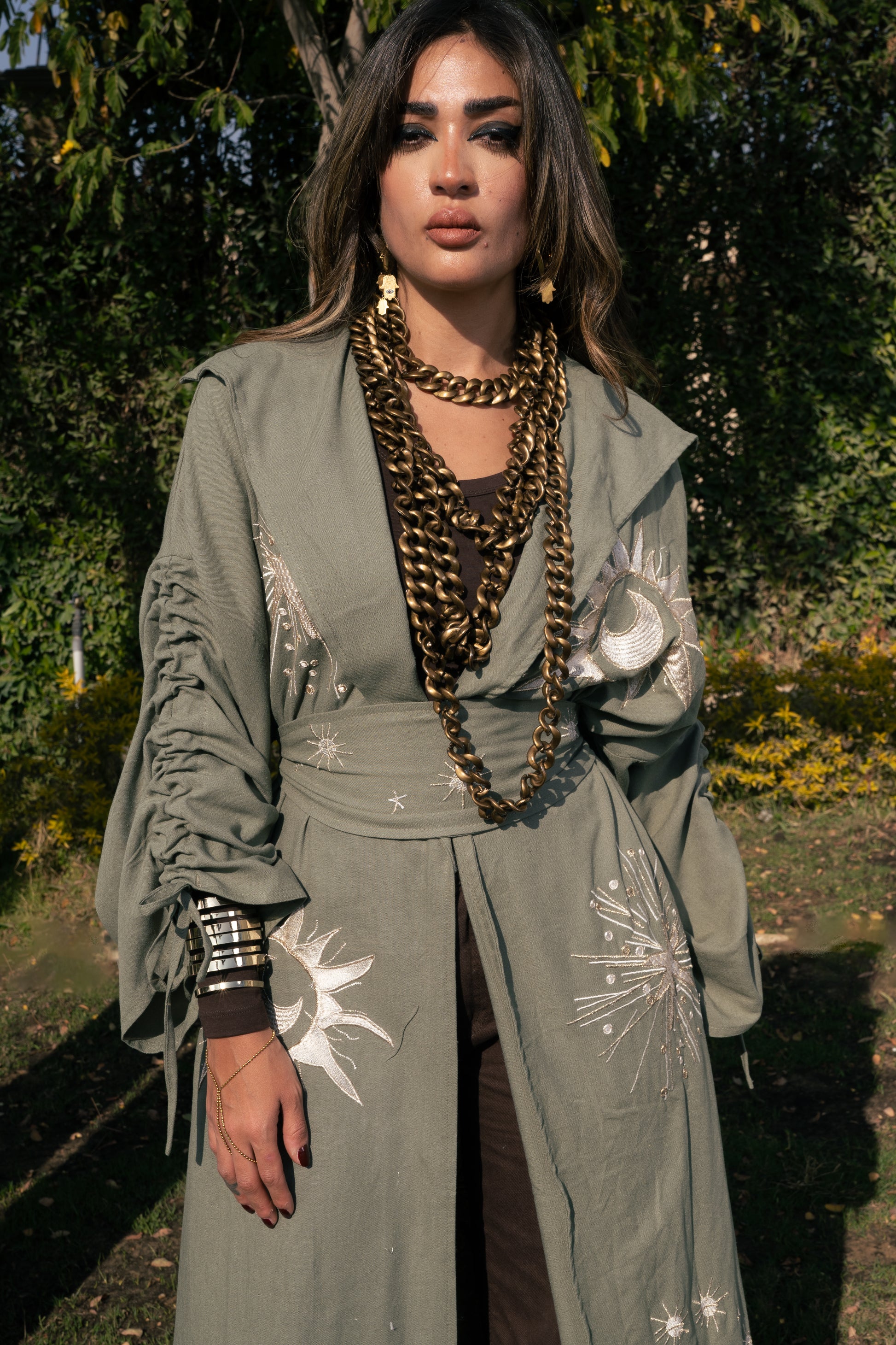 Timeless linen kaftan designed with elegant embroidery on both the front and back for a refined, artisanal finish—featuring wide belt and relaxed silhouette and natural texture.