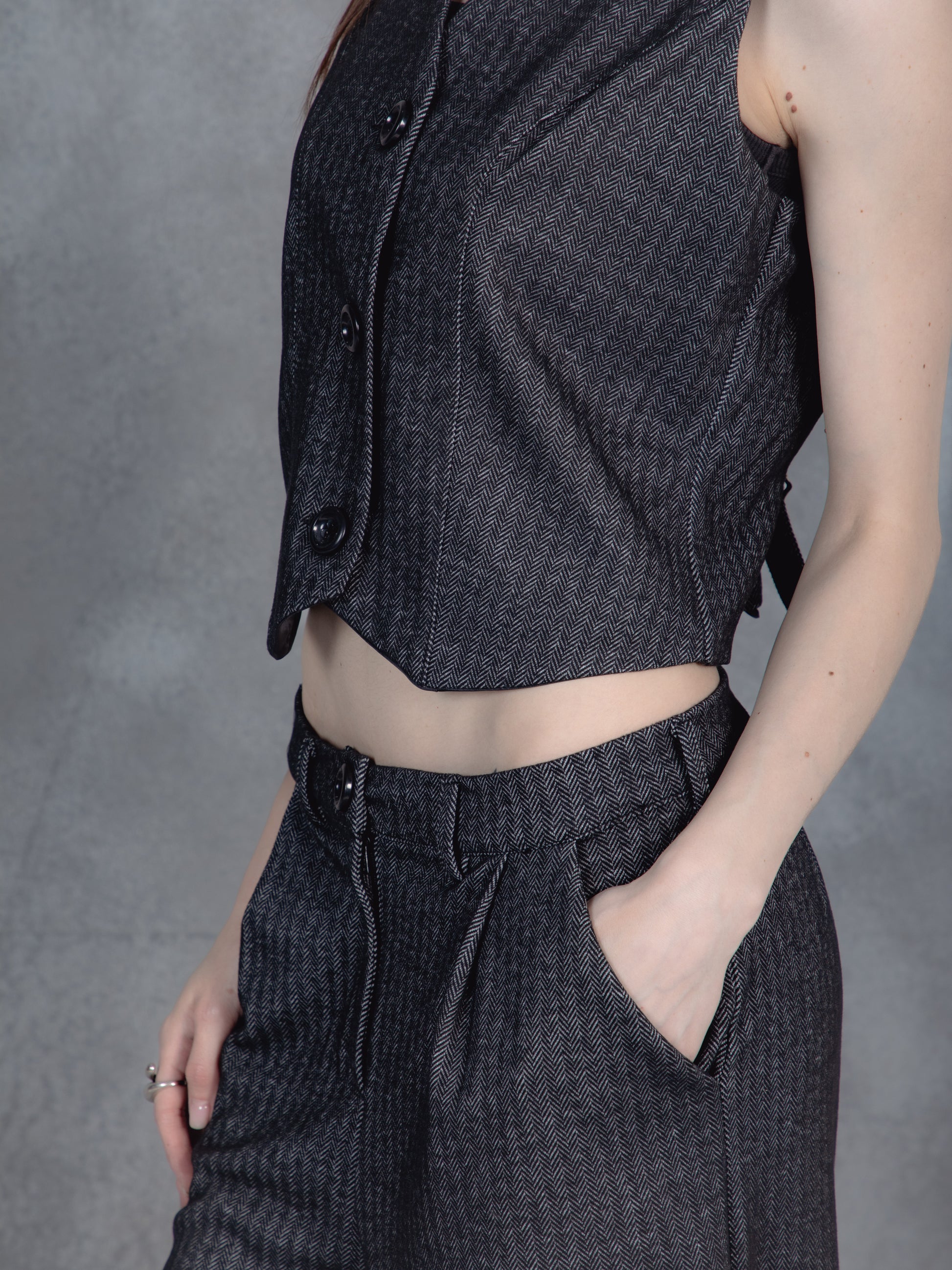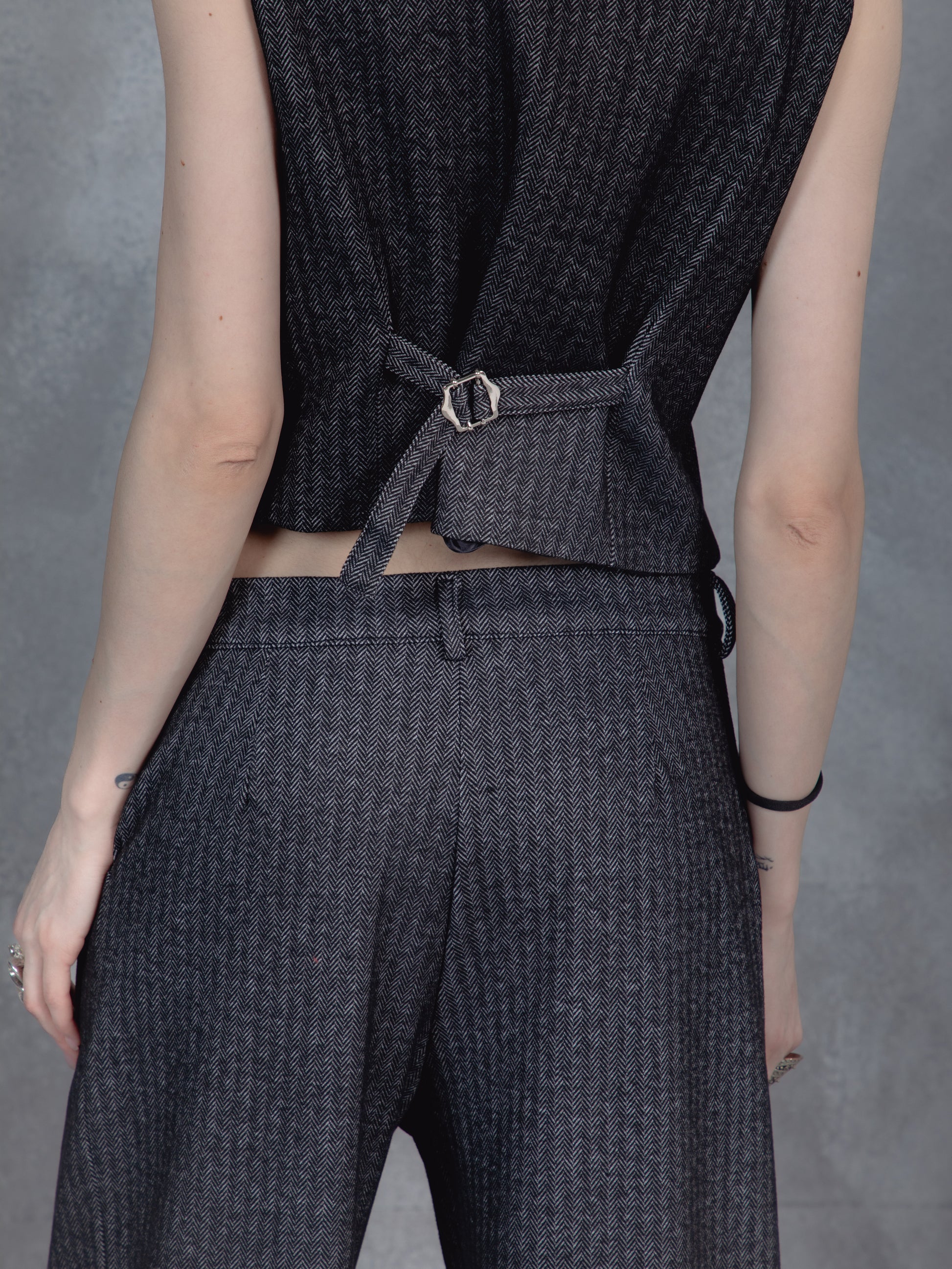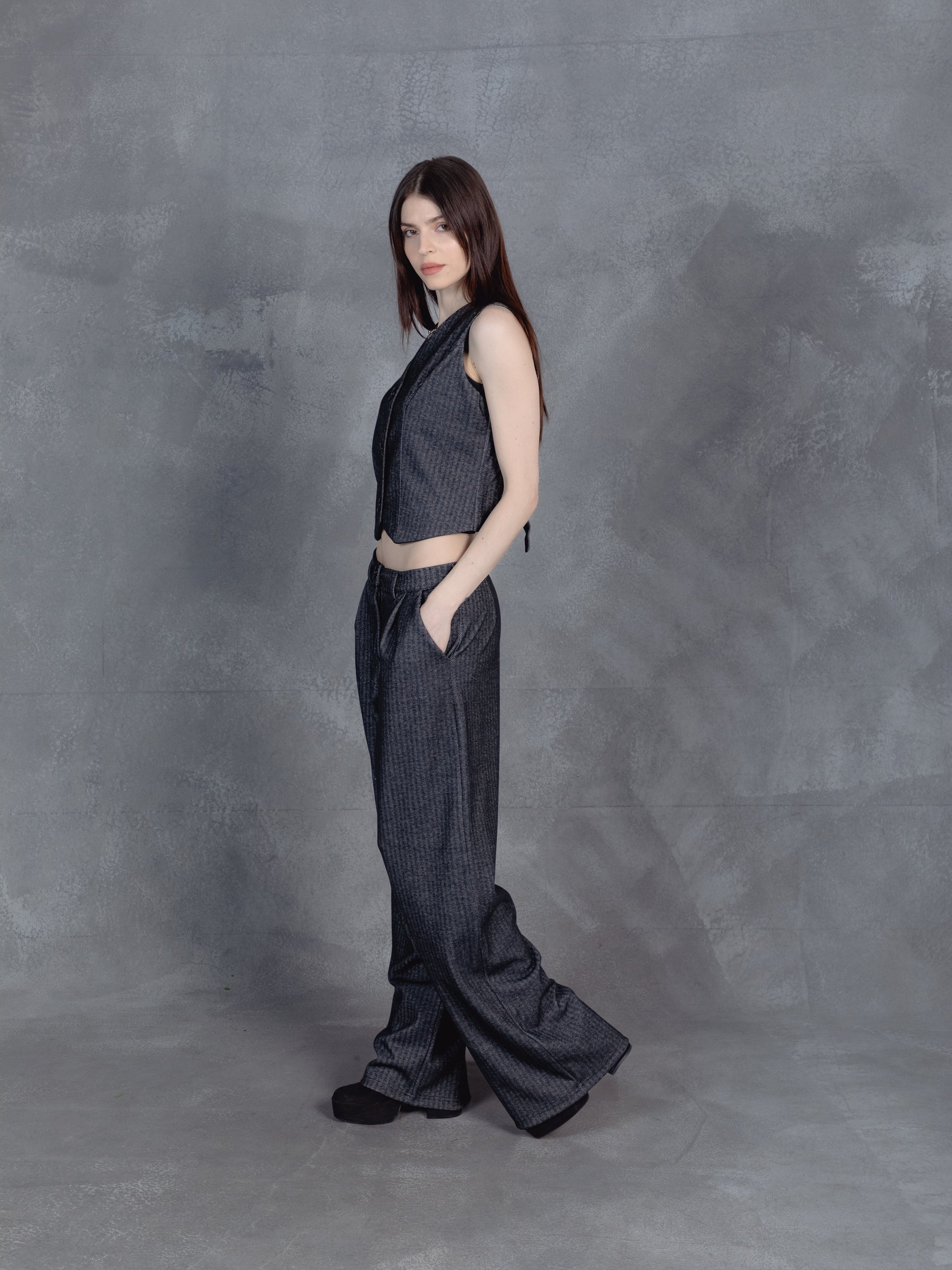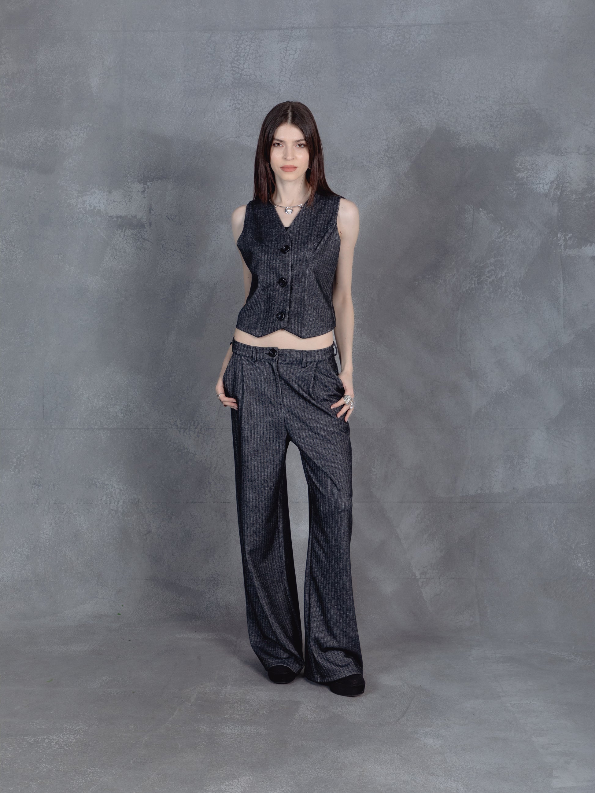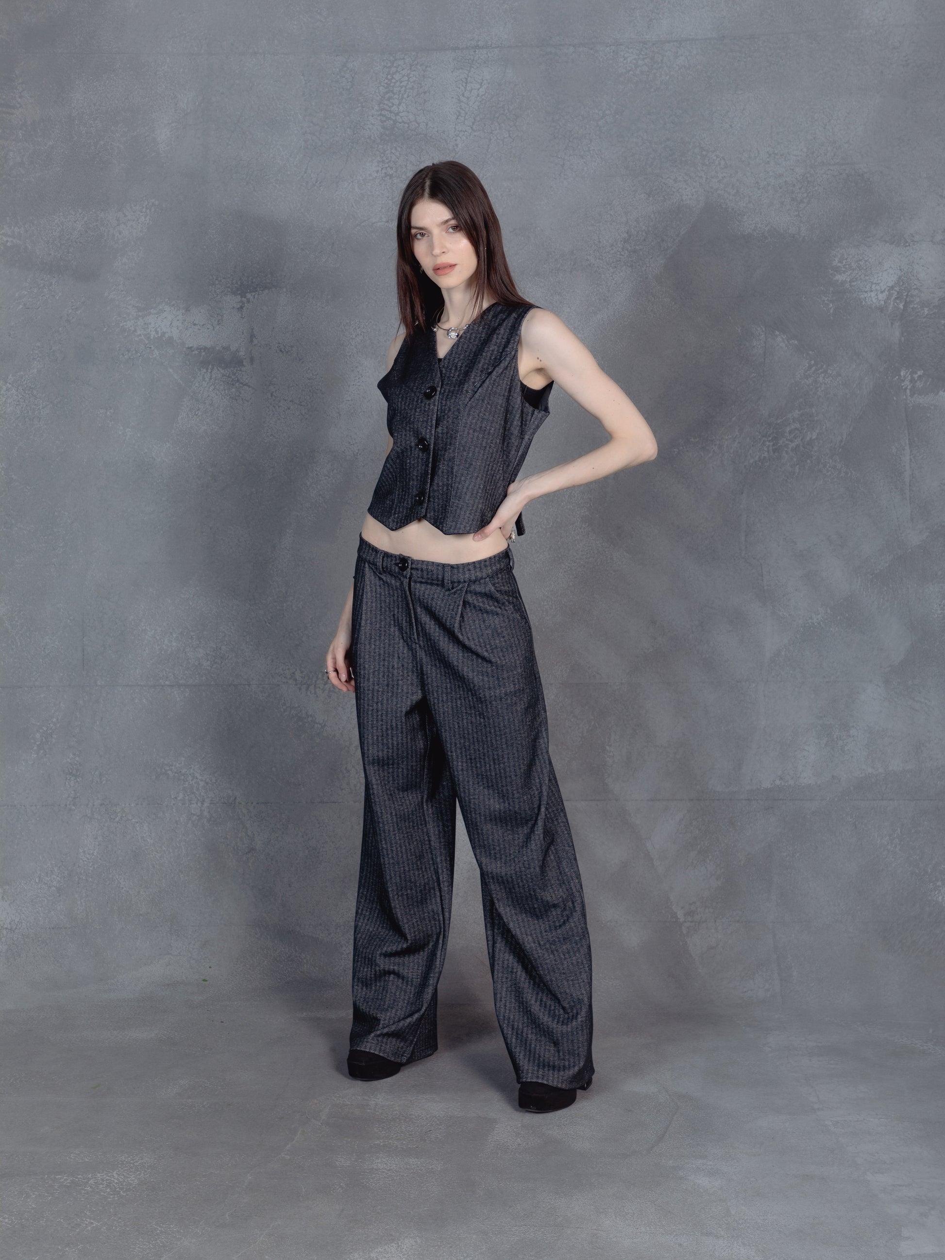 Tailored yet relaxed, this dark gray pinstriped duo blends boardroom polish with off-duty ease. The sleeveless vest and drawstring wide-leg trousers strike a balance between structure and flow. A modern uniform for those who lead with quiet confidence.